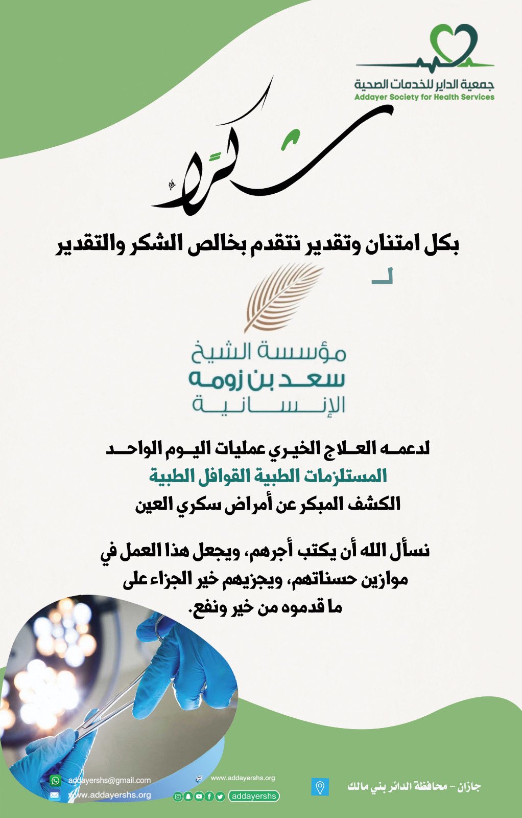 تتقدم جمعية الداير للخدمات الصحية بالشكر الجزيل لمؤسسة الشيخ سعد بن زومه الإنسانية لدعمهم برنامج مسار الصحة والذي يخدم المستفيدين بالقطاع الجبلي بمنطقة جازان .