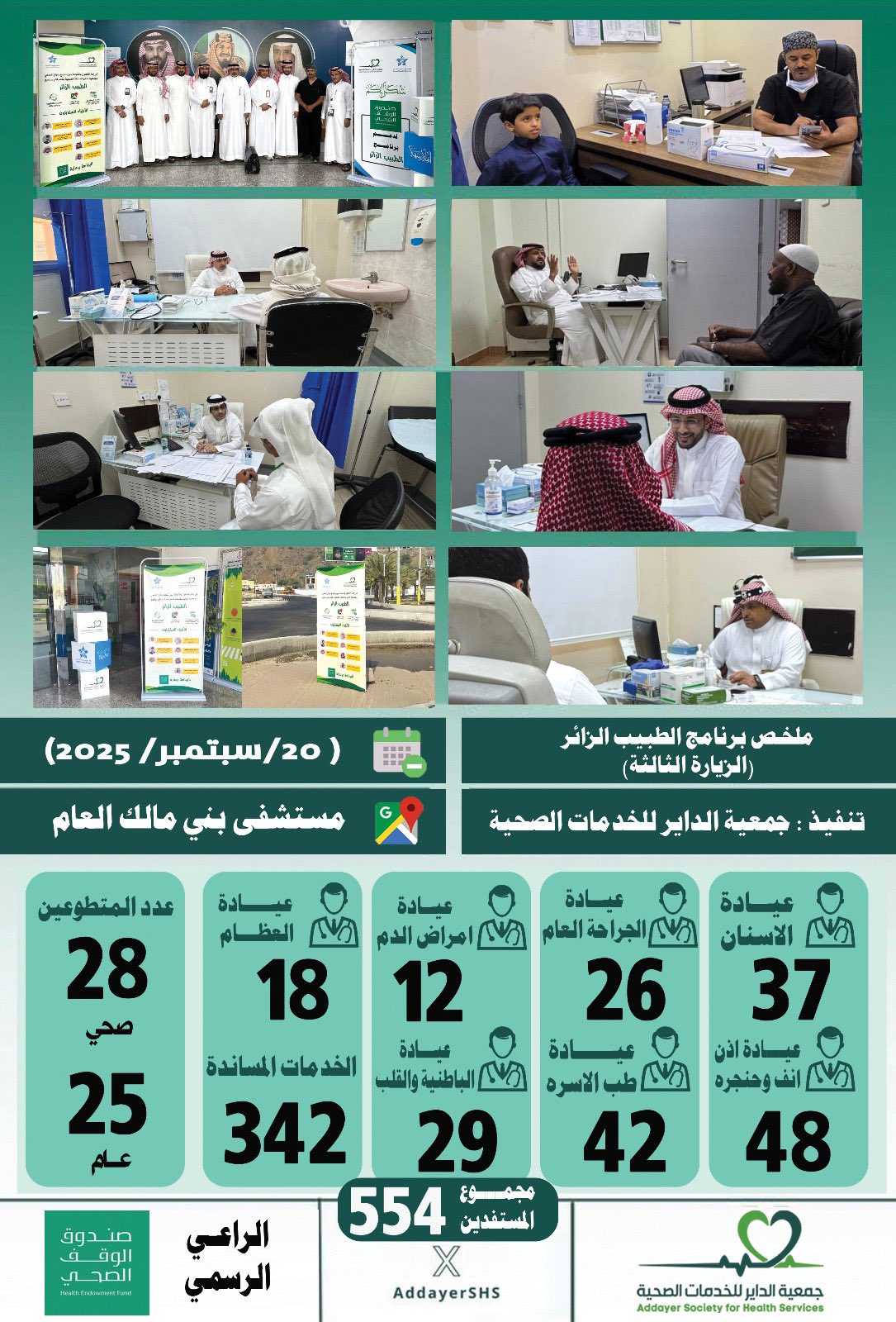 نفذت جمعية الداير للخدمات الصحية بالشراكة مع الحملة الصيفية للتوعية ومحو الأمية بـ مكتب تعليم الداير بتنظيم زيارة... الجمعية تنفذ زيارة للاستشاري الدكتور يحيى ماطر المالكي الى مركز الرعاية الصحية بآل يحيى