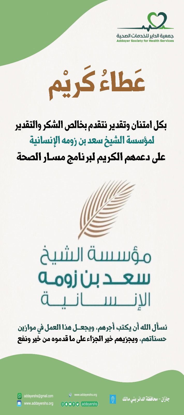 بحمد الله تم توقيع عقد شراكة بين جمعية الداير للخدمات الصحية و مؤسسة الشيخ سعد بن زومة الإنسانية لدعم برنامج مسار... الجمعية تعقد شراكة مع مؤسسة سعد بن زومة الإنسانية لدعم مسار الصحة بالجمعية -
