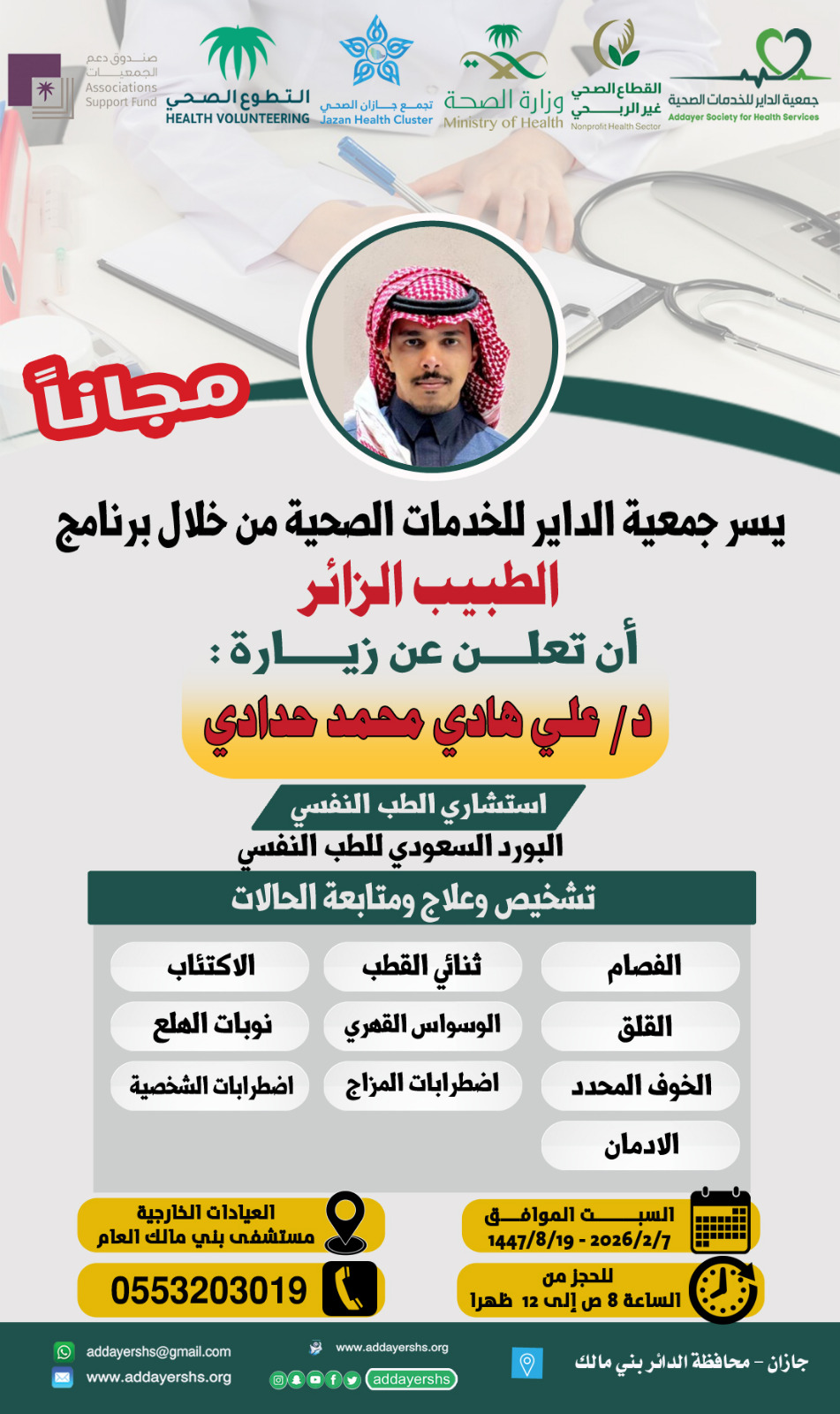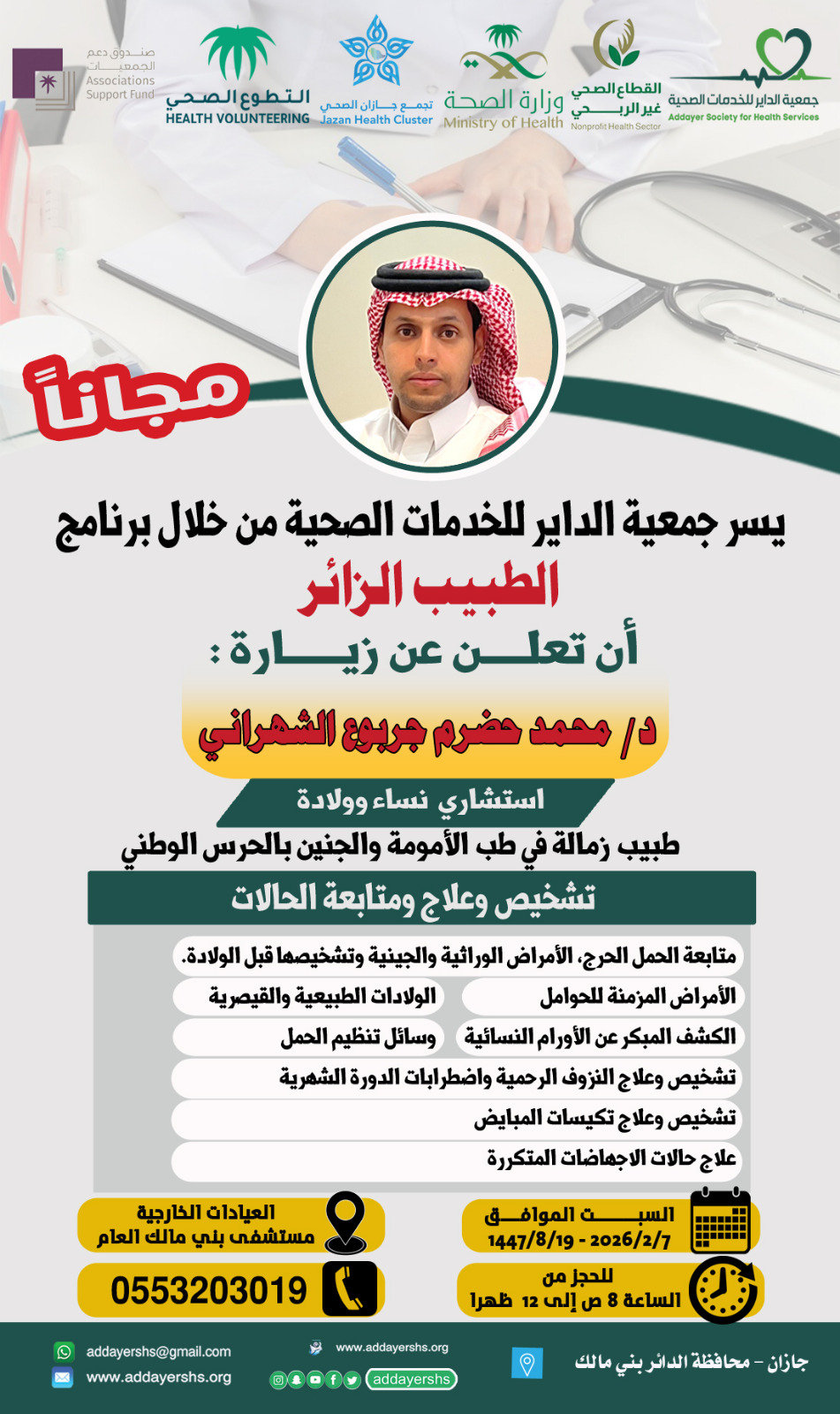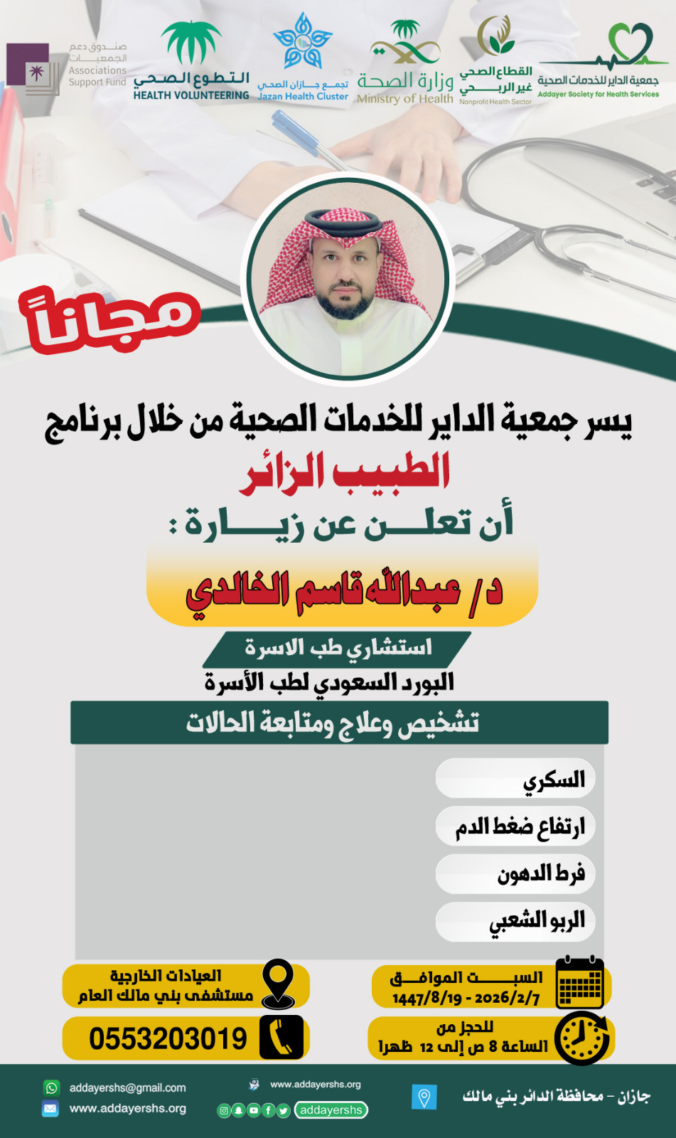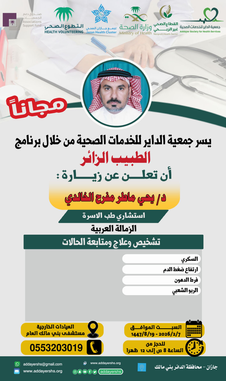 يسر جمعية الداير للخدمات الصحية بتعاون مع تجمع جازان الصحي وبدعم من (صندوق دعم الجمعيات)،ان تعلن عن برنامج (الطبيب الزائر)؛والذي يضم نخبه من الاستشاريين في مختلف التخصصات الطبية،وذلك في العيادات الخارجية لمستشفى بني مالك العام يوم السبت ٢٠٢٦/٢/٧م من الساعة ٨ص حتى ٢م.