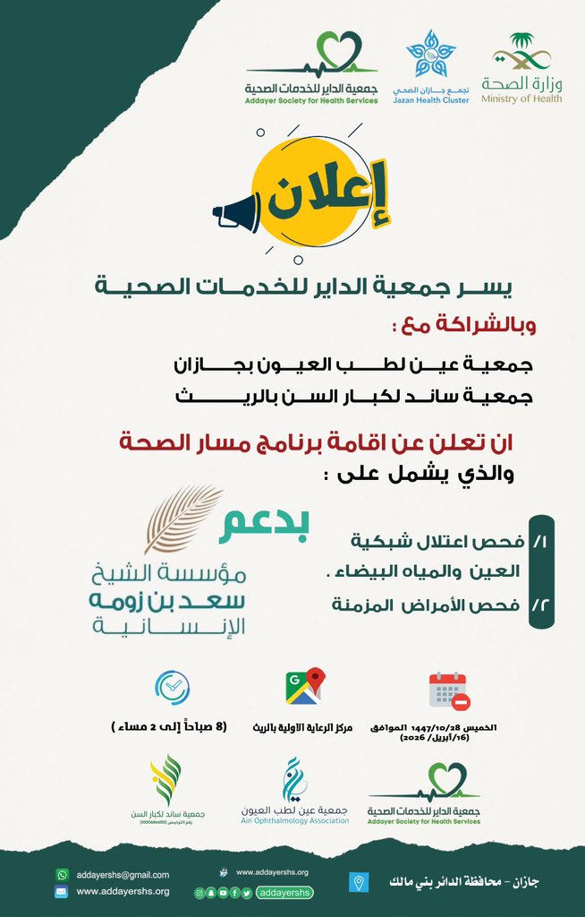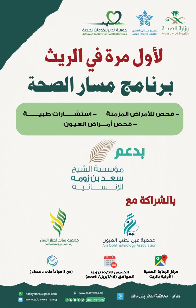 تُعلن جمعية الداير للخدمات الصحية بالتعاون مع جمعية عين لطب العيون بجازان وجمعية ساند لكبار السن بالريث؛عن انطلاق برنامج مسار الصحة، الذي يضم الفحص المبكر للأمراض المزمنة، وفحص أمراض العيون، وتقديم الاستشارات الطبية، وذلك بدعمٍ كريم من مؤسسة الشيخ سعد بن زومه.