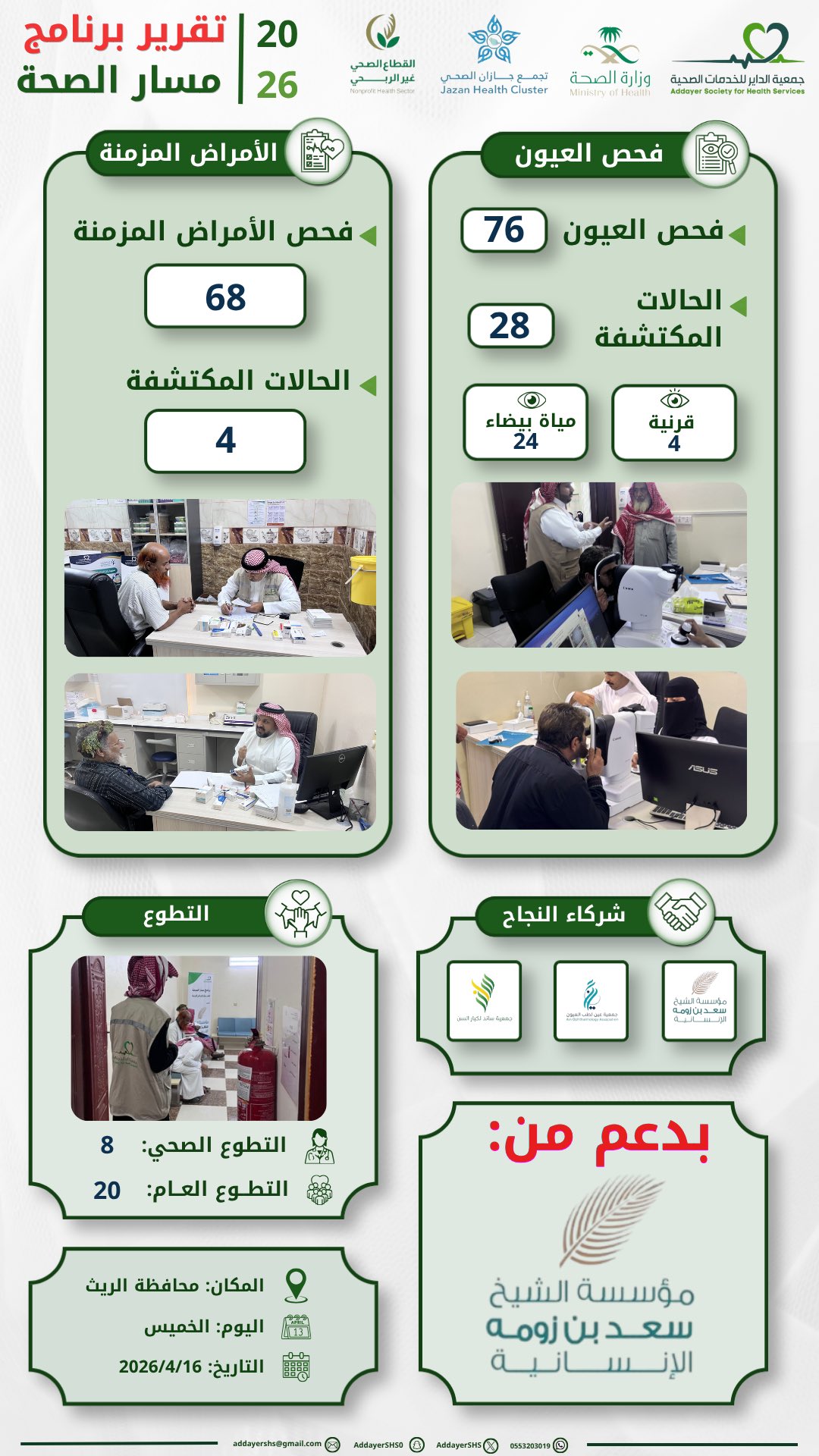 تقرير برنامج مسار الصحة المنفذ بمحافظة الريث يوم الخميس الموافق ٢٠٢٦/٤/١٦